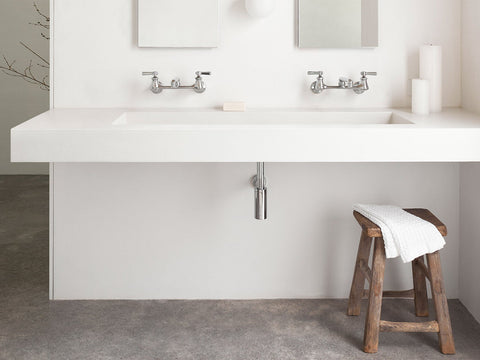 Built-in trough sinks seamlessly extend from the wall, offering a minimalist aesthetic similar to wall-mount designs but with the look of a built-in design.