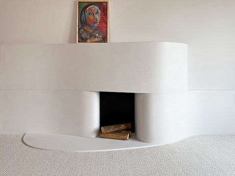 In the Listening Lounge designed by acclaimed designer and artist Leyden Lewis, Trueform collaborated on a bold architectural statement: the Wabele (Un)balanced fireplace surround. This piece is part of the new Wabele Collection, a trio of sculptural fireplace designs that explore sensuality, cultural memory, and cubist forms.