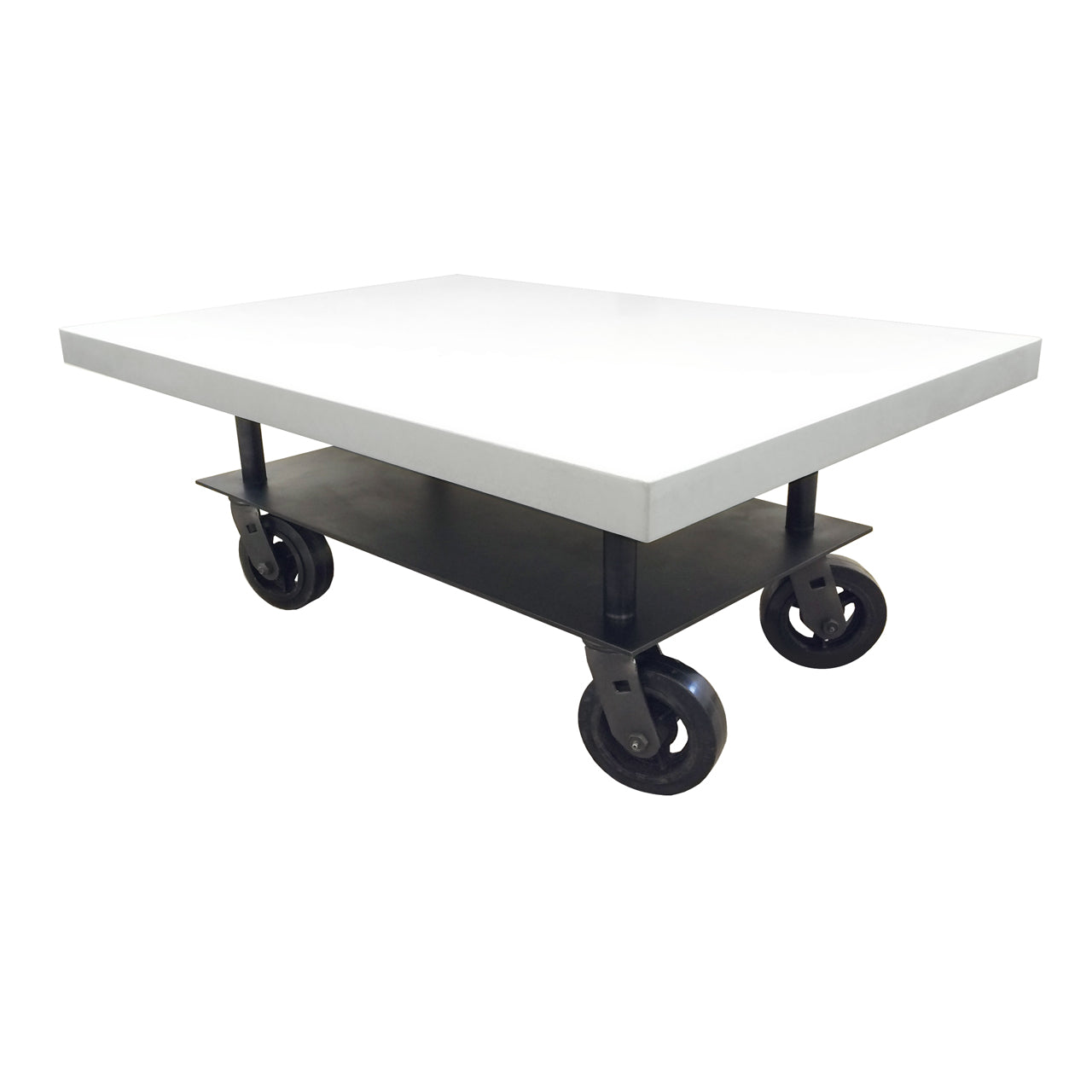 Satiny concrete and cold-rolled steel unite to make a clever coffee table with dual functions. The locking castor wheels enable both static use and the opportunity to roll away for nomadic entertaining. The metal shelf can store books, magazines, and remotes. The Nomadic Table was conceived by master designer Clodagh.
