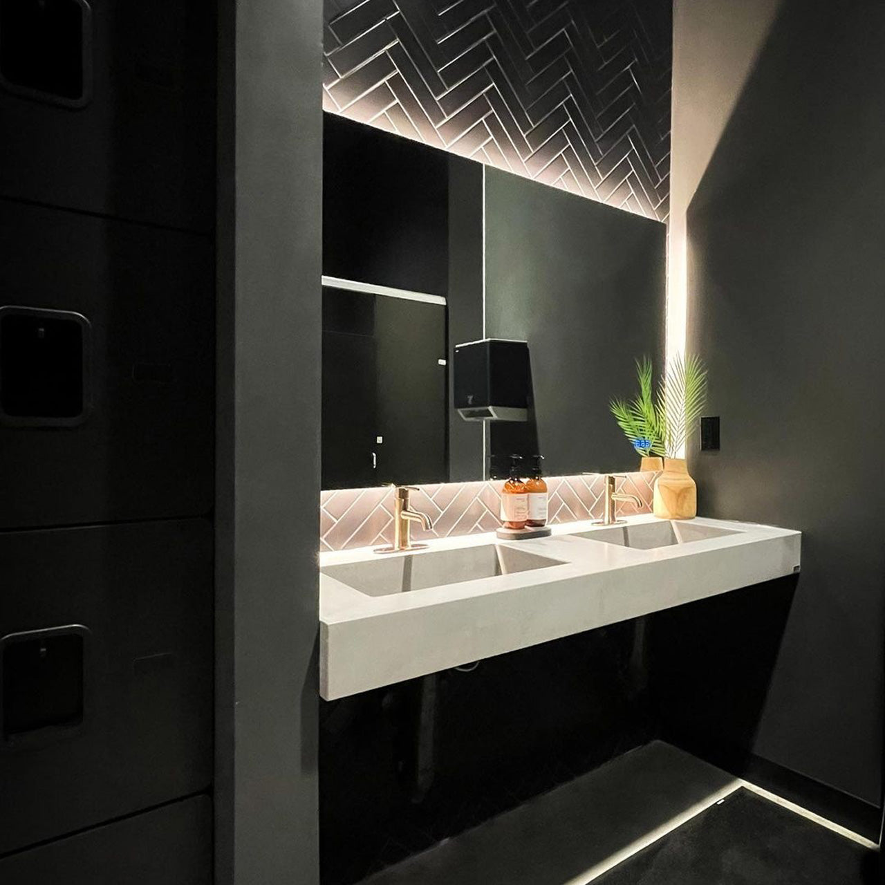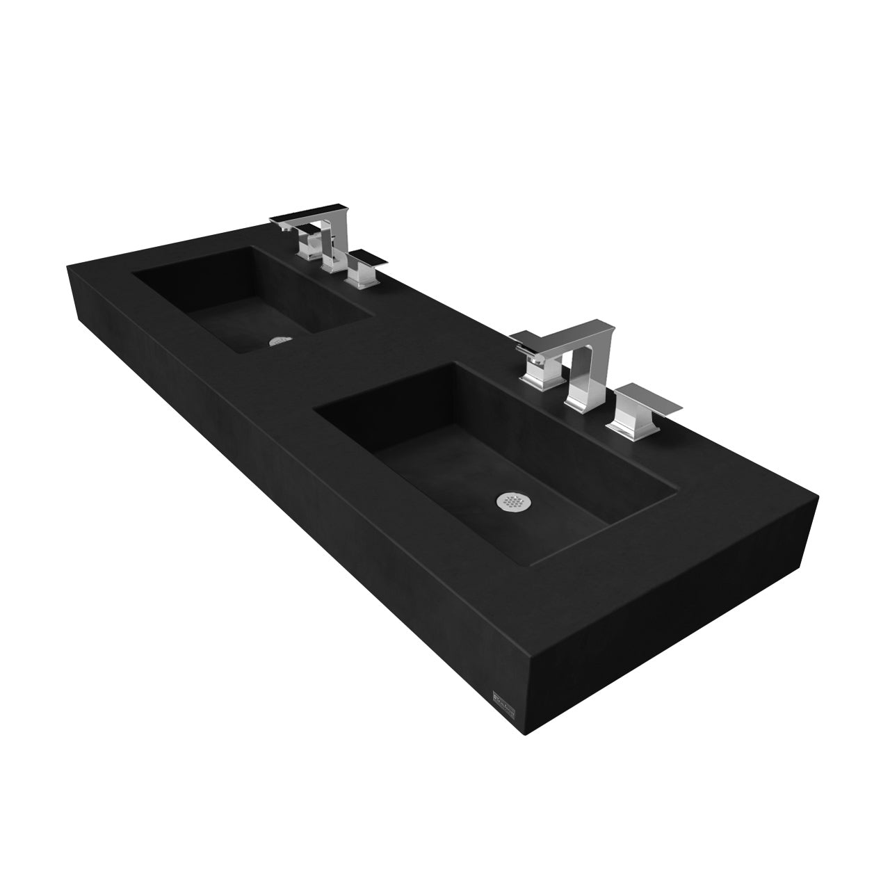 - Sink has a 5” profile and features a pair of integrated rectangular basins